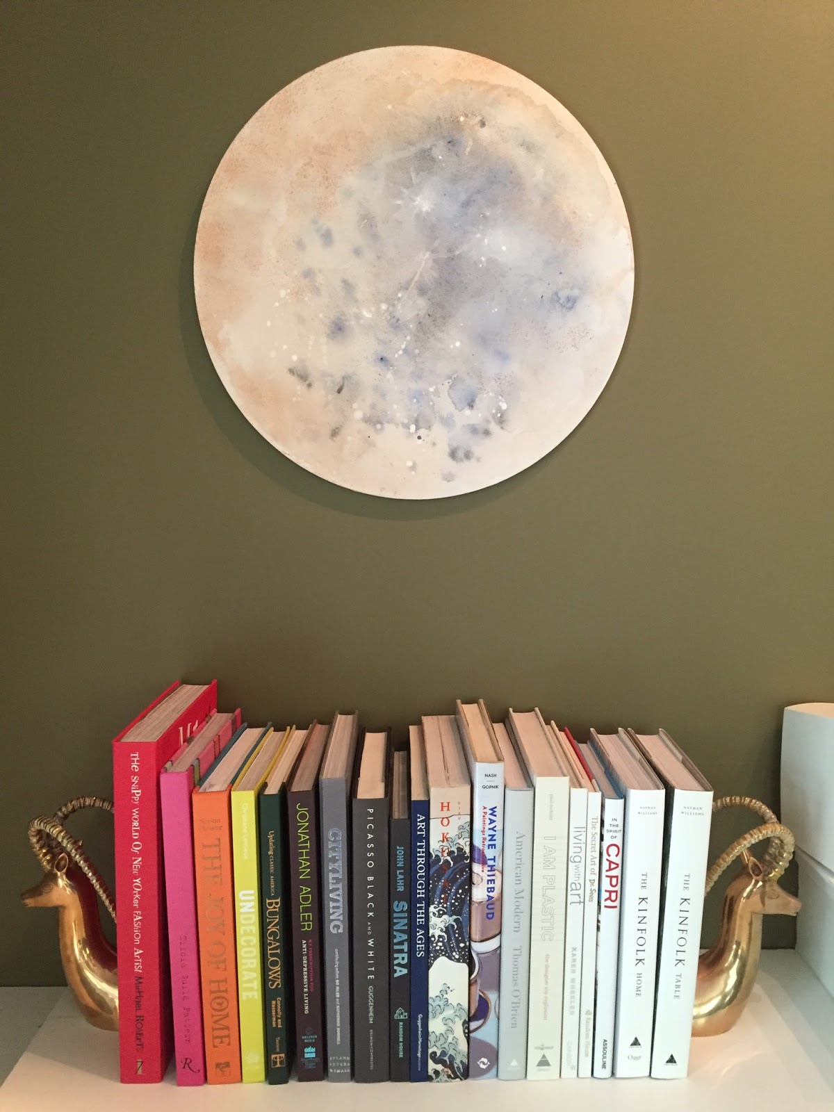 I am very, very, very slowly redecorating my house after the renovation. I recently came across this round canvas in my studio, and decided to paint a moon to hang in my TV lounge on a wall that used to house a giant Elfa shelf system. It measures about 20" in diameter, and I used acrylic paints in a water color fashion. It feels simple and uncluttered and I'm over the moon about it!